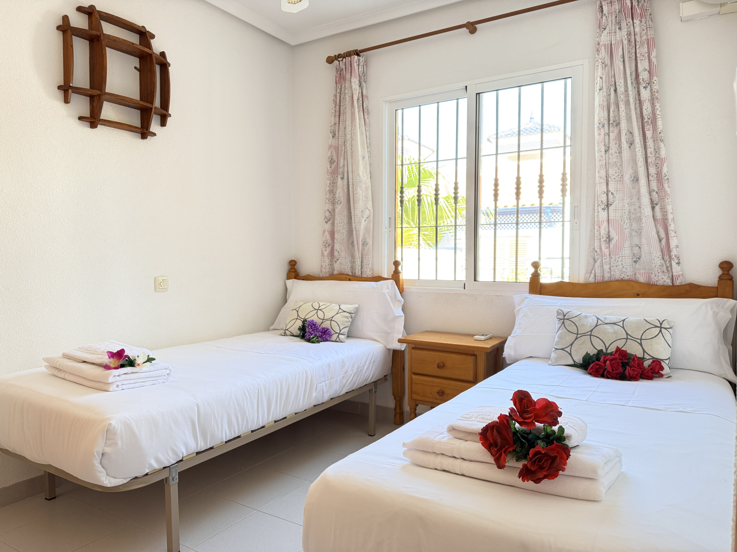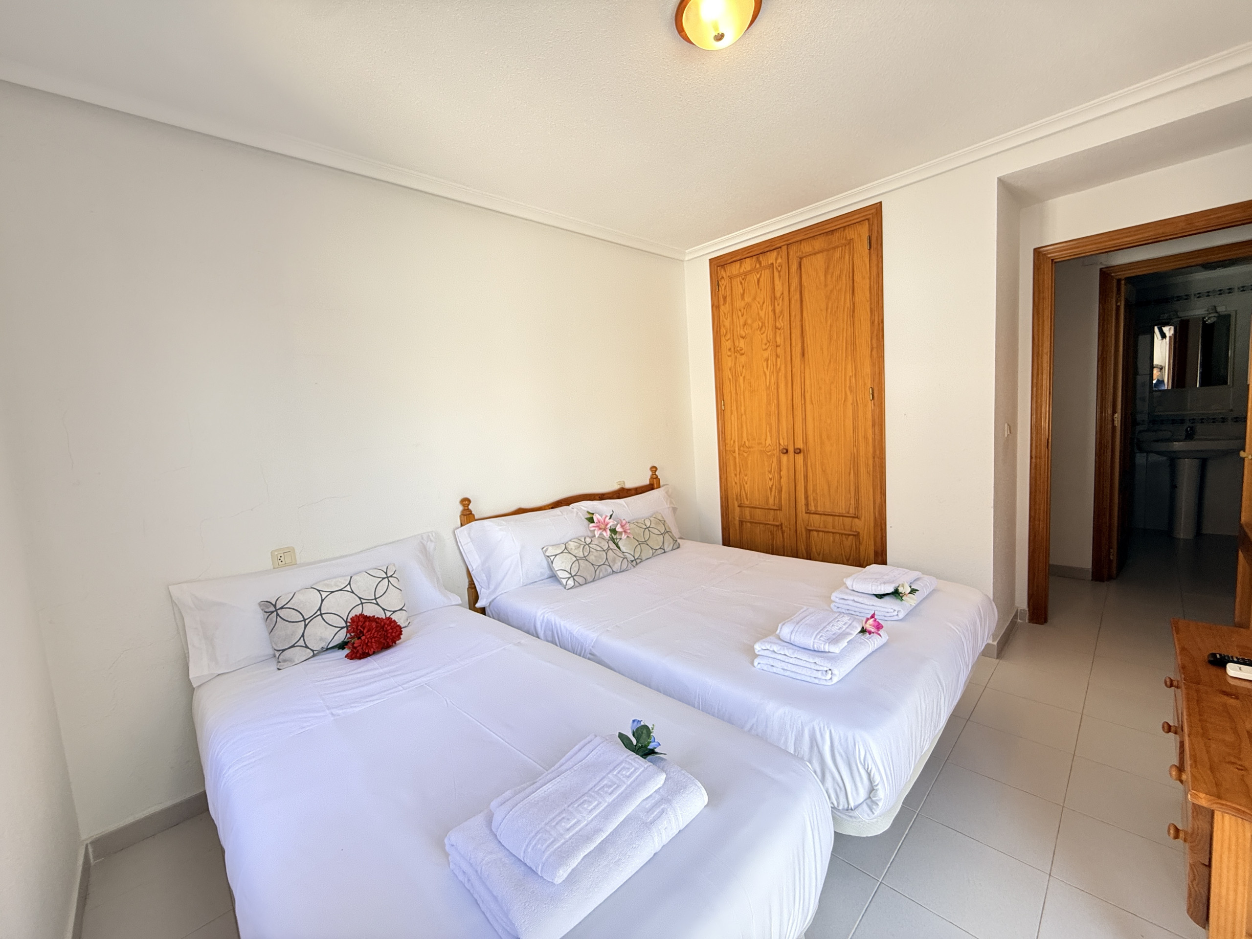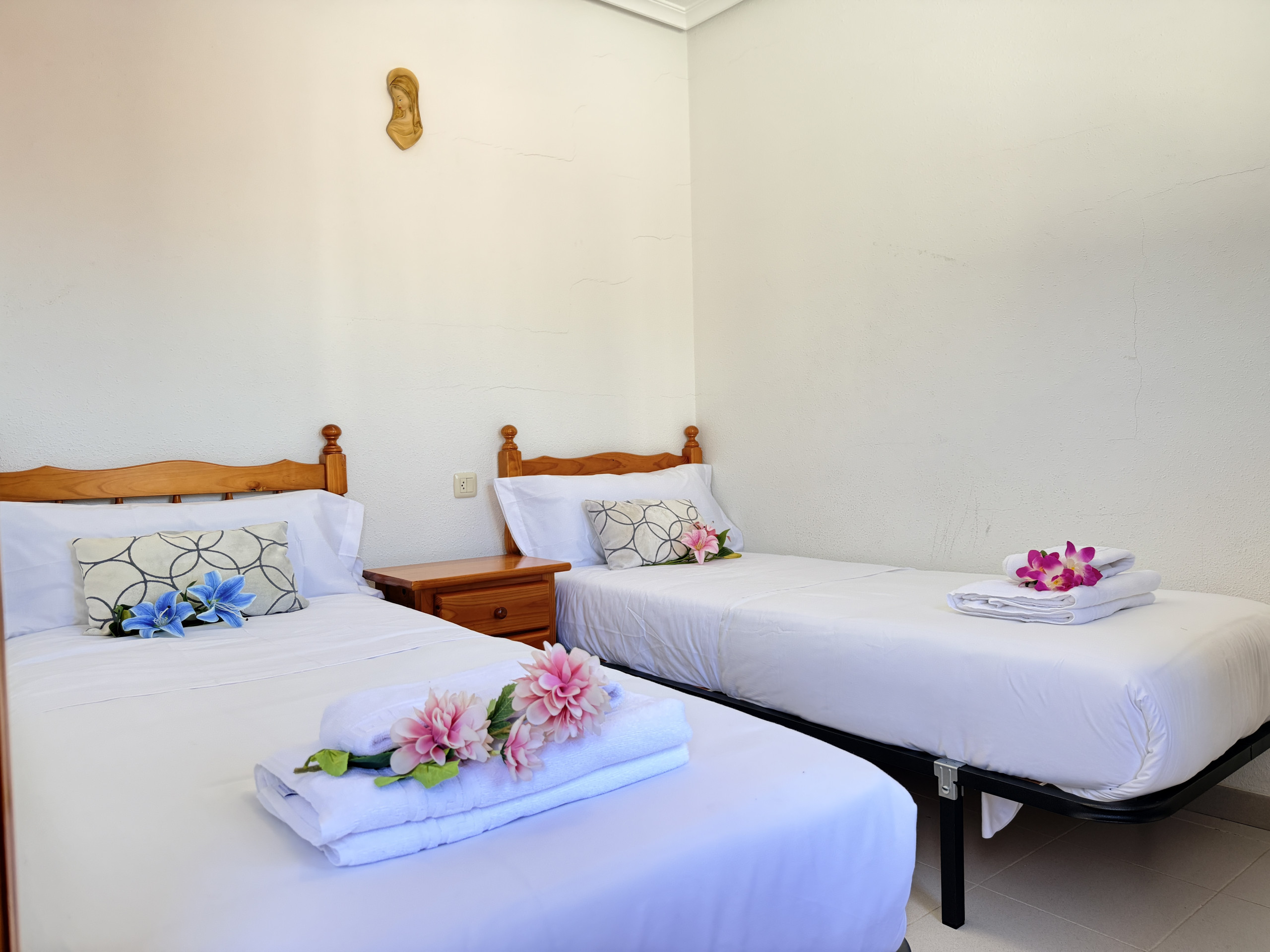 Primera Planta : Aquí se encuentran dos dormitorios acogedores. El primero cuenta con una cama doble y una cama individual, ideal para familias con niños pequeños. El segundo dormitorio dispone de dos camas individuales, ofreciendo un ambiente tranquilo y reparador.